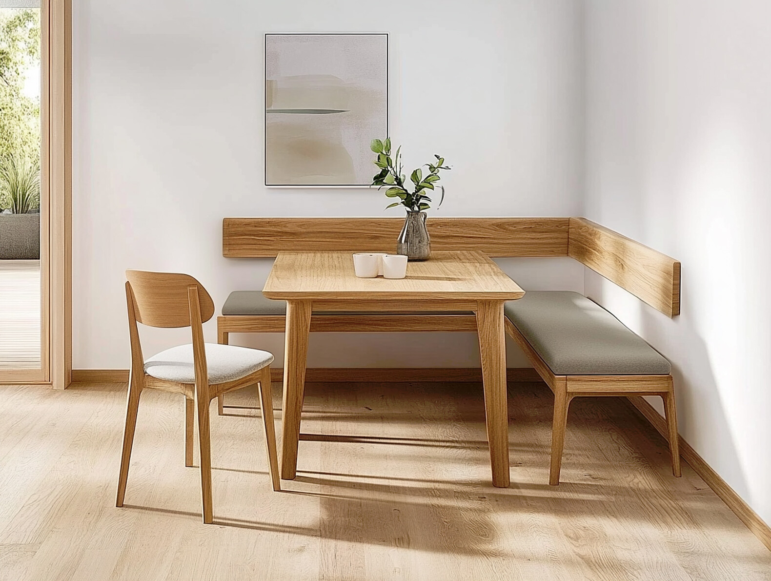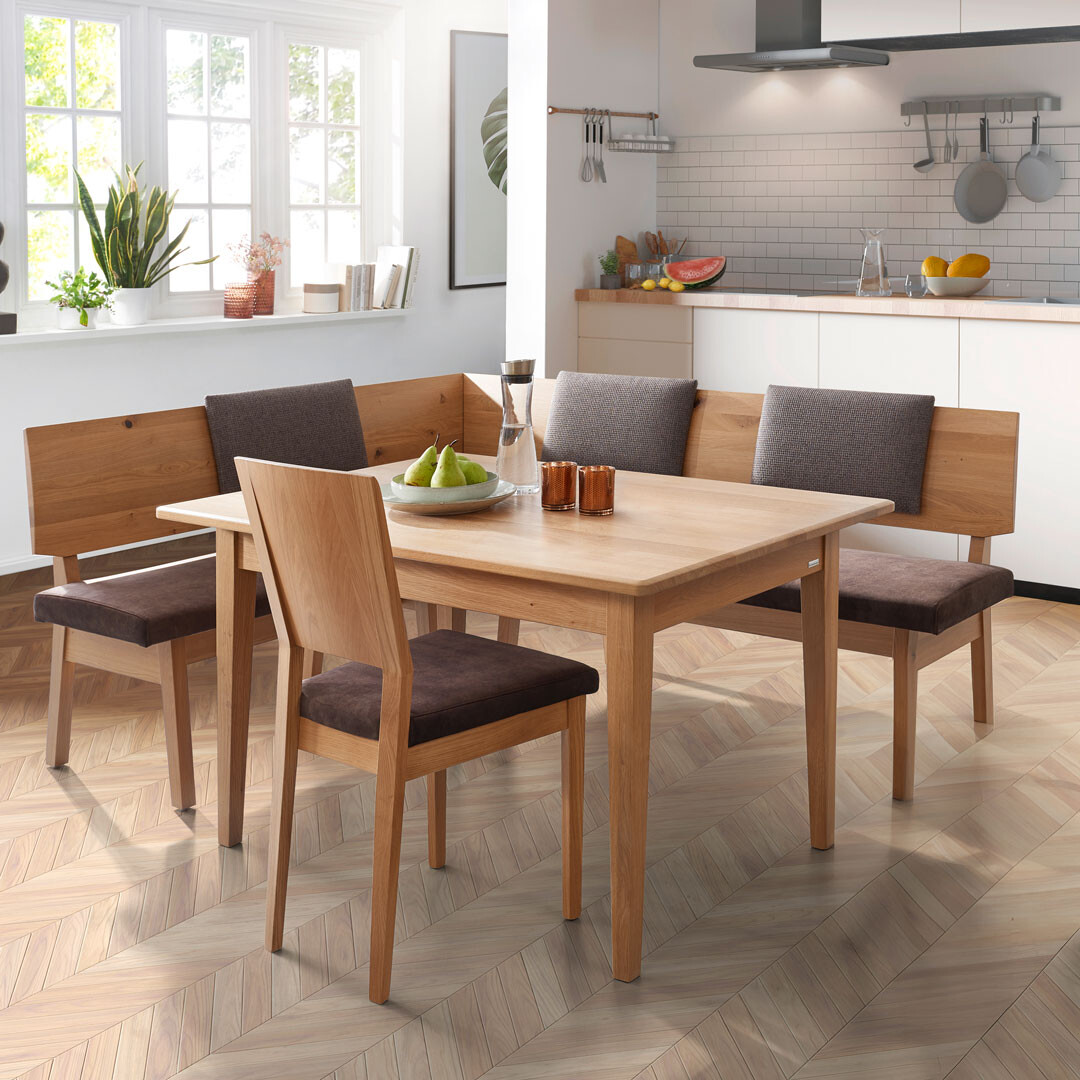 Eiche zählt zu den robustesten Holzarten überhaupt – und ist damit wie gemacht für eine Eckbank, die täglich genutzt wird. Ob im Familienalltag oder beim gemütlichen Beisammensein mit Gästen: Eine Eckbank aus massiver Eiche bleibt formstabil, zeigt kaum Gebrauchsspuren und bringt durch ihre natürliche Maserung Wärme und Charakter in den Raum. Dank hoher Festigkeit und ihrer Widerstandskraft gegenüber äußeren Einflüssen ist sie ein echtes Statement für Nachhaltigkeit – und für bleibende Werte.