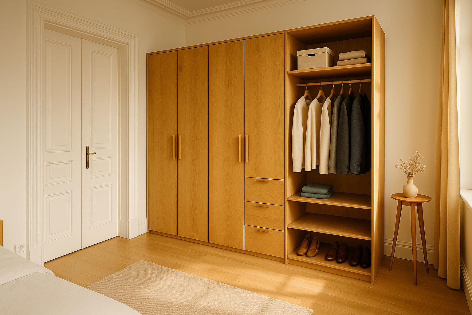 Online bekommst du vieles – aber nicht das Gefühl, wenn ein Kleiderschrank mit großen Türen sich leise öffnet und der Inhalt auf einen Blick vollständig sichtbar ist. Maßgefertigte Eckschränke, Kleiderschränke oder raumhohe Planungen bieten mehr als nur Maße – sie bieten Struktur. Wir planen so, dass ausreichend Platz eingeplant ist und du wirklich Platz für deine Kleidung hast. Und natürlich: Platz zum Öffnen der Türen.