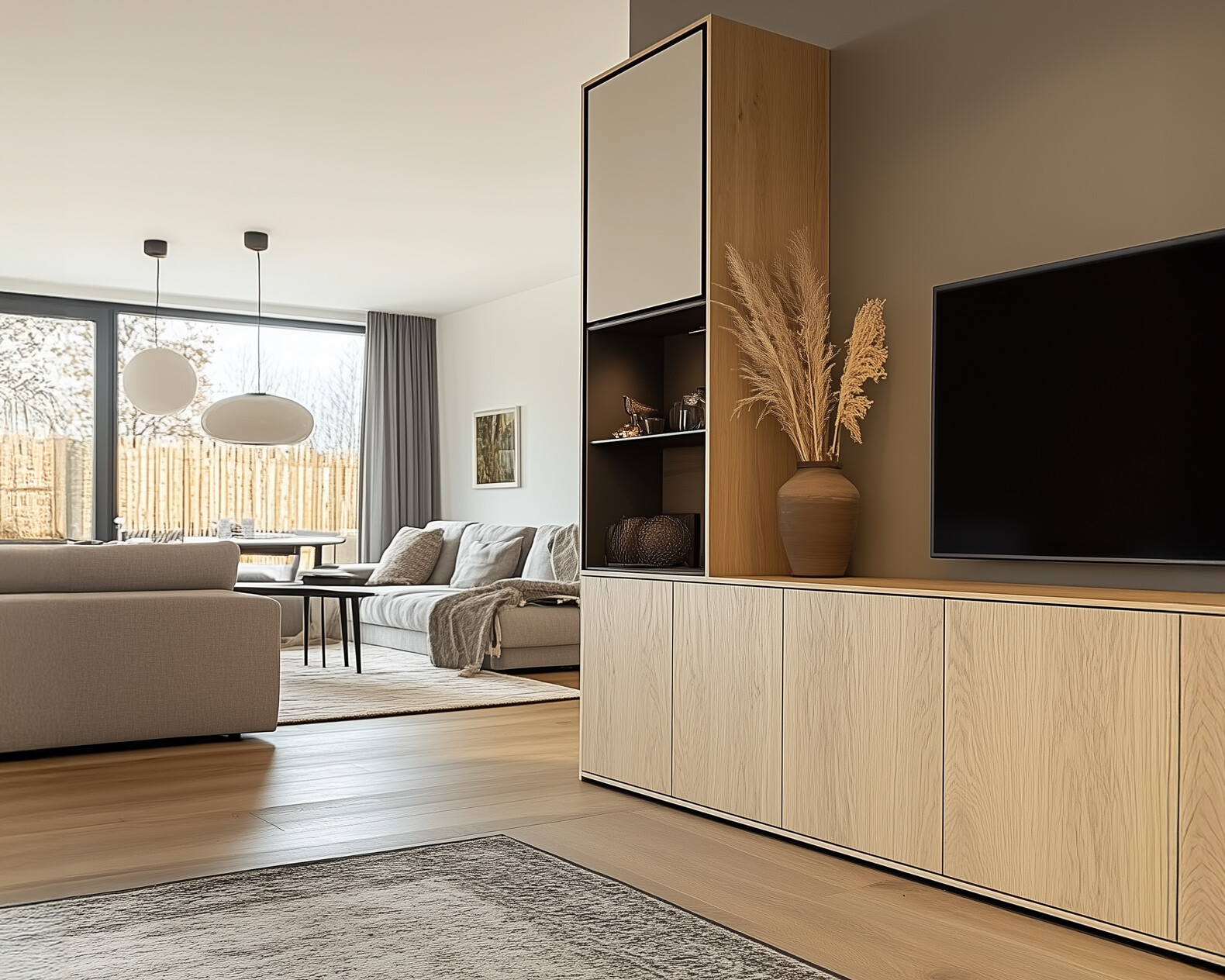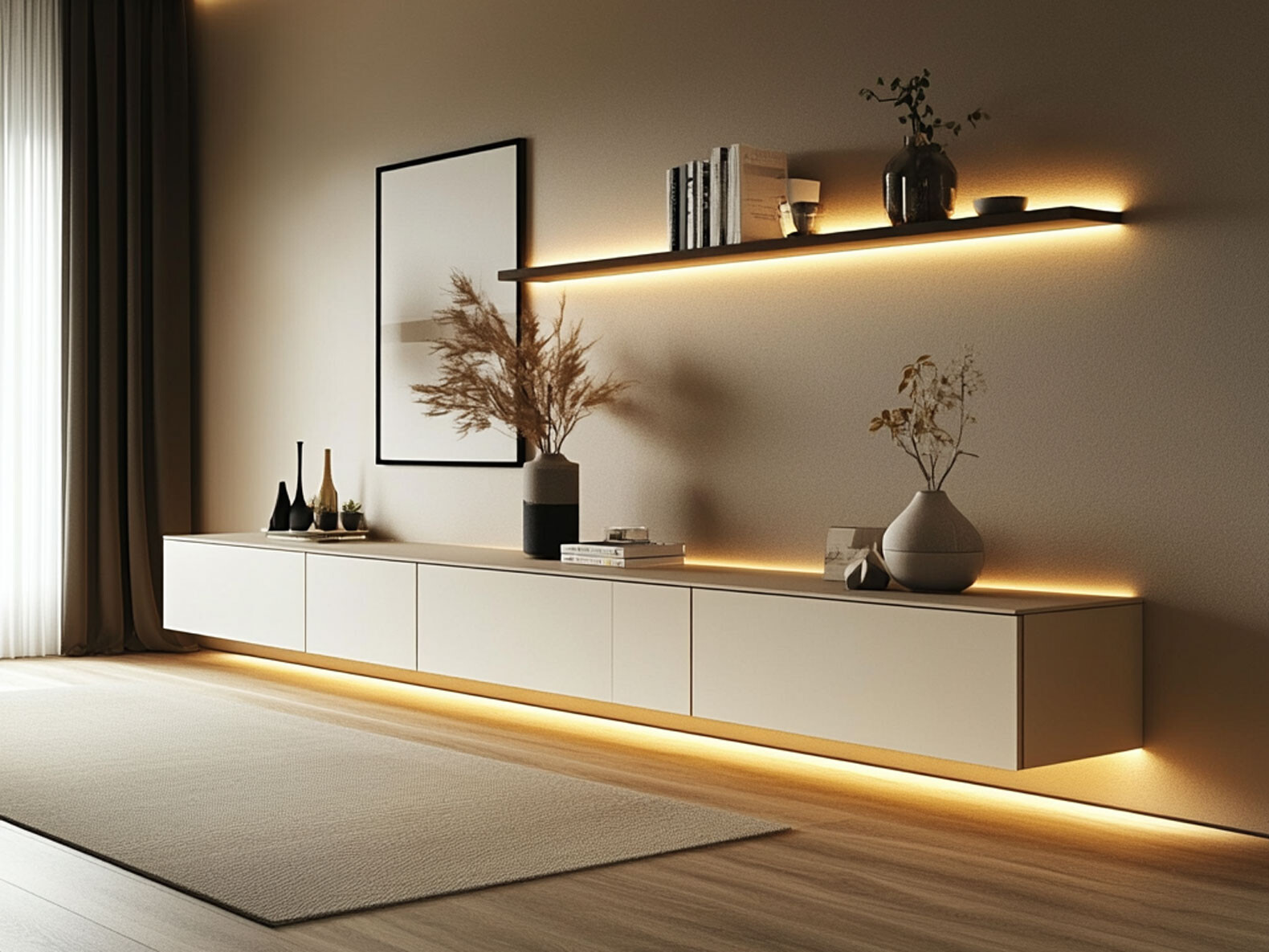 In kleinen Räumen gilt: Weniger ist oft mehr! Hängende Sideboards und TV-Boards sind ideale Stauraumwunder, da sie den Boden freilassen und dem Raum eine luftige, leichte Atmosphäre verleihen. Durch die Wandmontage wirkt der Raum größer und bleibt flexibel. Setze auf neutrale Farben und klare Linien, um Unruhe zu vermeiden. Für Akzente sorgen dekorative Accessoires wie kleine Vasen, Bücher oder Pflanzen, die in offenen Fächern platziert werden können.
