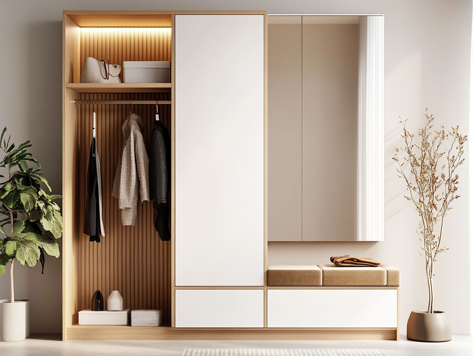 Stauraumwunder für Flur: Türen, offene Fächer, Kleiderstange, Schubladen