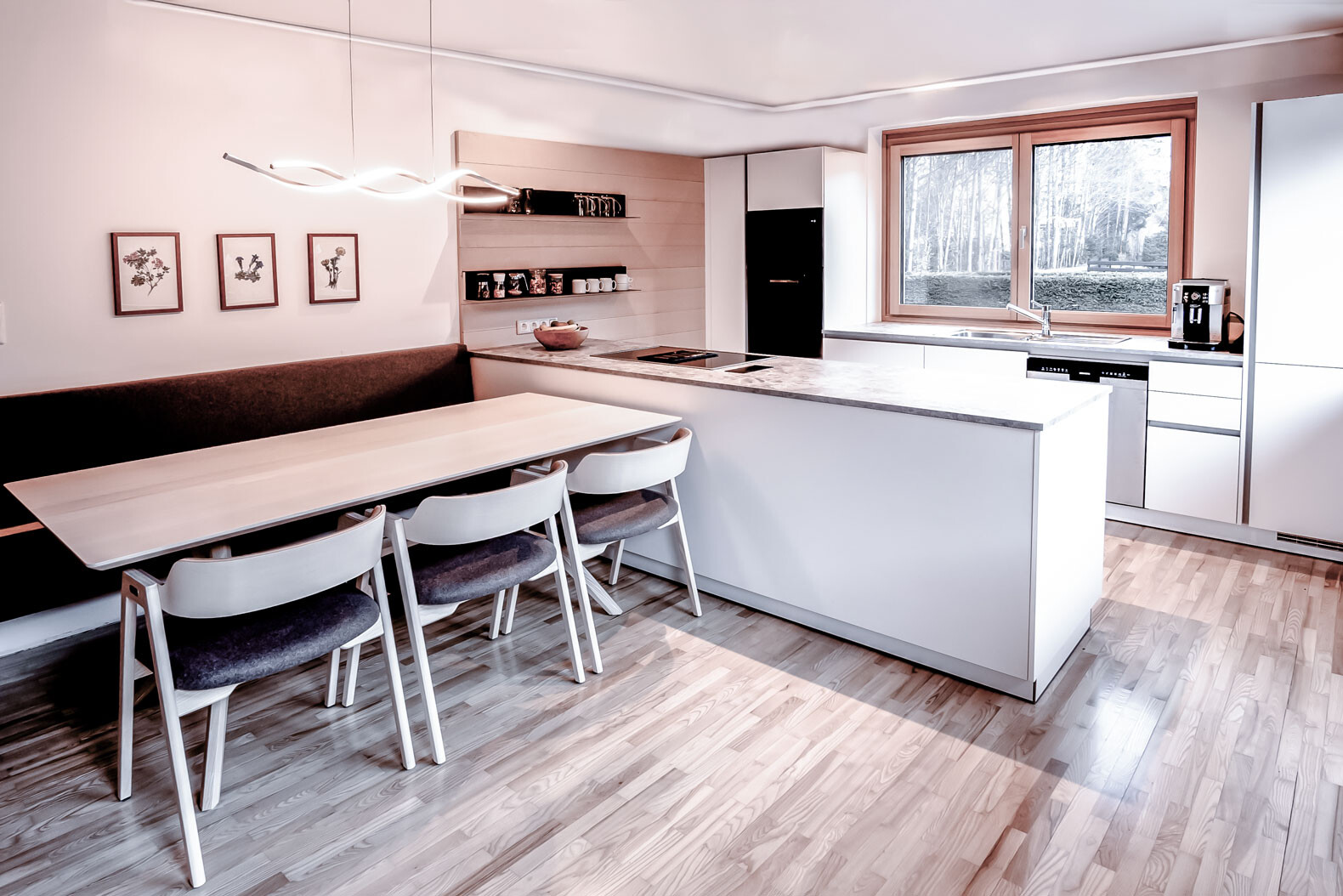 Eine maßgefertigte Küche aus unserer Tischlerei lässt sich perfekt mit dem Essbereich verbinden – sowohl optisch als auch funktional. Durch individuelle Küchenplanung entstehen fließende Übergänge zwischen Küche und Wohnbereich, abgestimmt auf Raumgröße, Licht und Stil. Küchenfronten, Oberflächen und Arbeitsplatten werden dabei harmonisch auf Esstisch, Sitzmöbel oder Sideboard abgestimmt. Ob Hochglanzfront, natürliche Holzoberfläche oder elegante Kombination – jede Tischlerküche wird maßgeschneidert geplant und vom erfahrenen Monteur präzise umgesetzt. So entsteht Qualität aus Österreich, die Handwerkskunst, Funktionalität und Wohngefühl vereint – für einen stimmigen Wohntraum aus einem Guss.