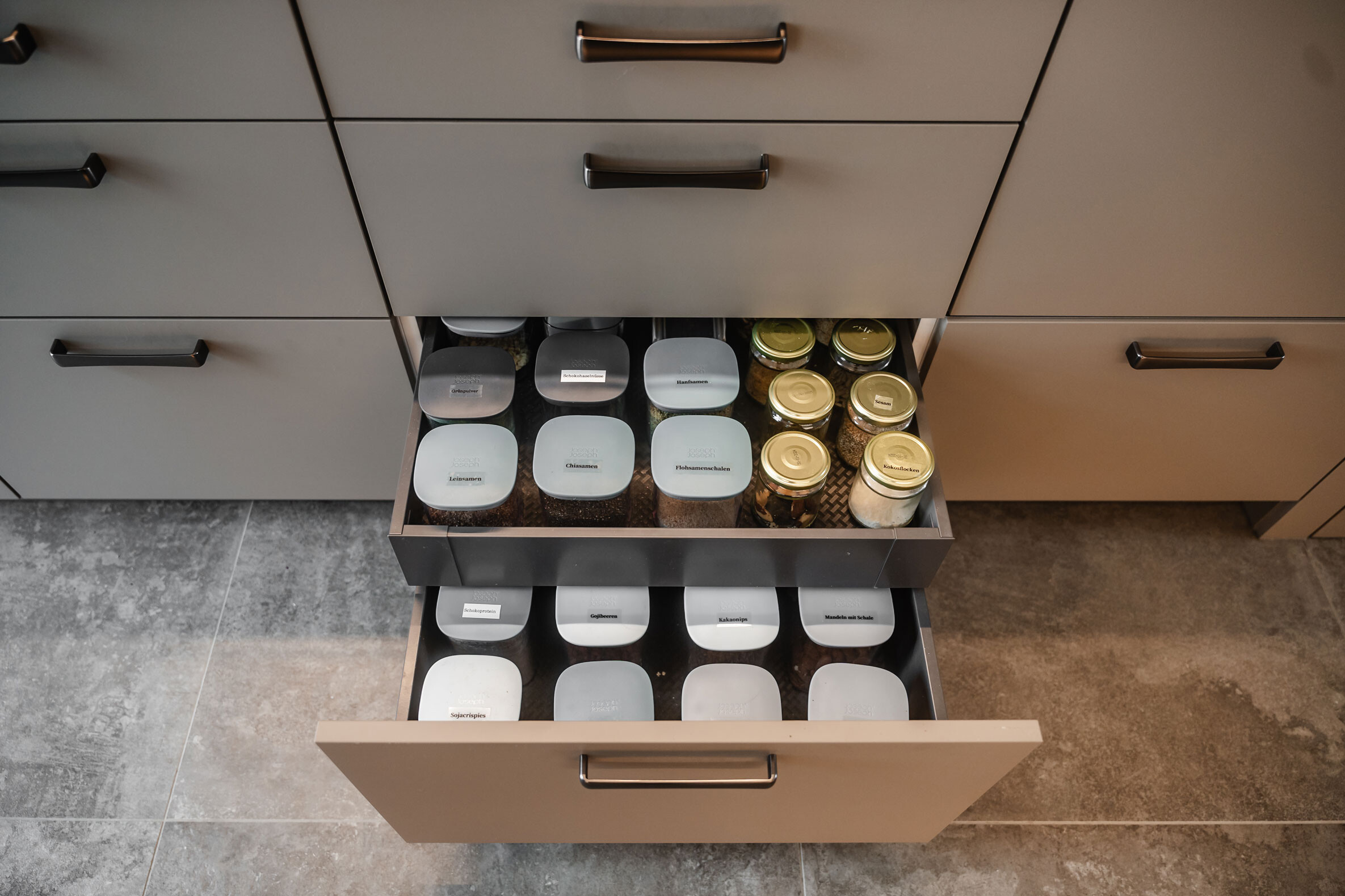 Stauraum ist für viele Kunden ein zentrales Thema, besonders in einer kleinen Küche. Wir bieten individuelle Lösungen, die optimal auf deine Bedürfnisse abgestimmt sind. So lassen sich etwa ausziehbare Regale für den Vorratsschrank, drehbare Gewürzschubladen oder versteckte Fächer in deine Küche integrieren – alles so geplant, dass du schnell und komfortabel arbeiten kannst.